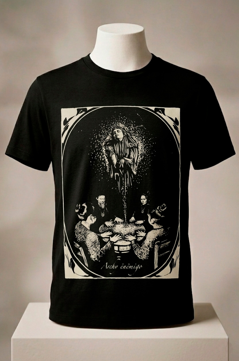 Camiseta 100% algodón con ilustración de inspiración esotérica, dibujada a mano. Una pieza de estética oscura y simbólica que aporta carácter y presencia a cualquier look.