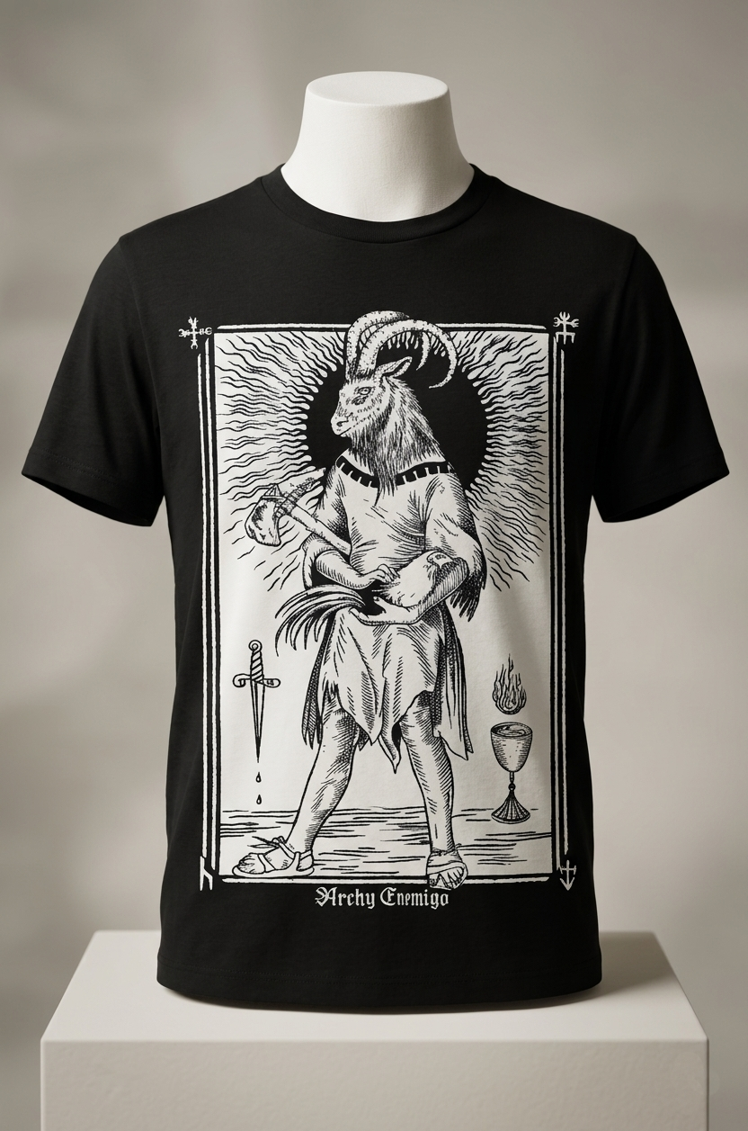 Camiseta 100% algodón con ilustración de cabra de estilo ocultista, dibujada a mano. Una pieza de carácter oscuro, gráfica y atemporal.
