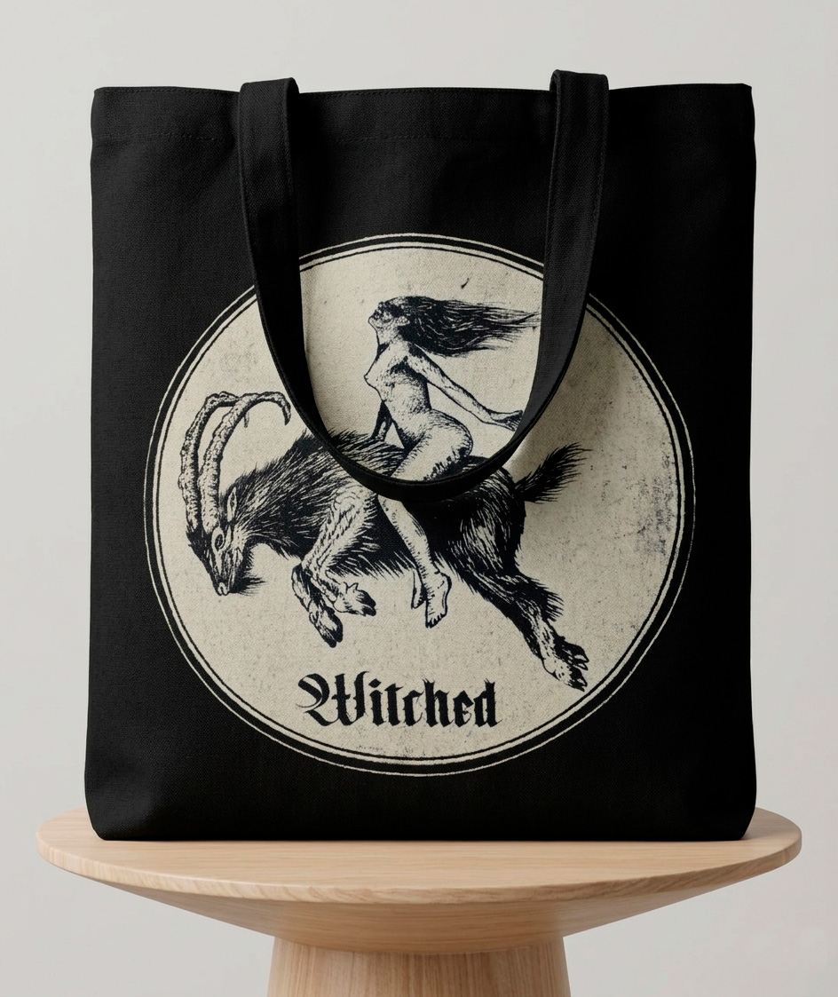 Tote bag negra con ilustración de estilo oscuro y acabado visual vintage. Un diseño llamativo y con mucha personalidad, ideal para quienes buscan un accesorio diferente para el día a día. Práctica, cómoda y fácil de combinar, perfecta para llevar tus esenciales con un toque alternativo.